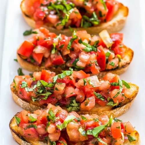 Classic Homemade Bruschetta is a timeless Italian appetizer that captures the essence of fresh ingredients and simple preparation. Originating from the rustic kitchens of Italy, this dish features toasted bread topped with a vibrant mixture of tomatoes, basil, garlic, and olive oil. The crunchy texture of the bread contrasts beautifully with the juicy, flavorful topping, making it an irresistible starter for any gathering. Perfect for weeknight meals or family-friendly occasions, Classic Homemade Bruschetta showcases the natural flavors of its ingredients, appealing to both casual diners and gourmet enthusiasts. With its bright colors and refreshing taste, this dish is not just food; it is a celebration of fresh produce and culinary simplicity.