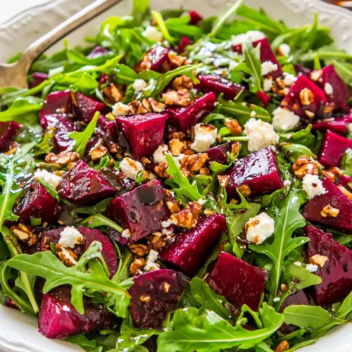The Fresh Beet Salad With Arugula And Balsamic Vinaigrette is a vibrant dish that beautifully combines earthy, sweet roasted beets with the peppery notes of arugula, all brought together by a tangy balsamic vinaigrette. This salad is perfect for a weeknight meal or a family gathering, offering not just a feast for the eyes but also a delightful array of flavors that appeal to both adults and children. The standout qualities of this dish are its health benefits, colorful presentation, and the versatility of ingredients that can be adjusted to suit various dietary preferences. Whether served as an appetizer or a main course, this Fresh Beet Salad With Arugula And Balsamic Vinaigrette is sure to impress and satisfy.