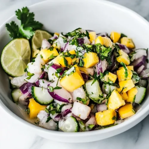 Fresh Mango Cucumber Ceviche That’s Deliciously Simple is a refreshing and vibrant dish that perfectly marries the sweetness of ripe mangoes with the crispness of cucumbers. This dish is not only a feast for the eyes but also a flavorful treat that can brighten up any meal. Ideal for warm weather gatherings, weeknight dinners, or a light lunch, this ceviche offers a delightful explosion of flavors that will appeal to family and friends alike. The combination of fresh ingredients ensures that every bite is packed with nutrients, making it a healthy choice for those looking to enjoy a guilt-free indulgence. Its standout qualities include an easy preparation method and versatility, allowing it to be served as a starter, snack, or even a side dish. The vibrant colors and textures of Fresh Mango Cucumber Ceviche That’s Deliciously Simple make it a perfect centerpiece for your table, ensuring everyone will want a taste.