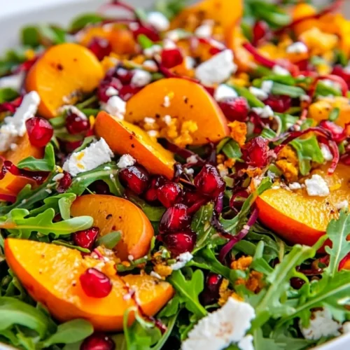 Fresh Persimmon Salad With Maple Vinaigrette is a vibrant and refreshing dish that highlights the unique flavor of persimmons, complemented by a sweet and tangy vinaigrette. This salad is perfect for those looking to elevate their weeknight meals or impress guests at family gatherings. The combination of juicy persimmons, crisp greens, and the rich maple vinaigrette creates a harmonious balance of flavors and textures. Whether you are serving it as a side dish or as a light main course, this salad is not only visually appealing but also packed with nutrients. Ideal for any season, Fresh Persimmon Salad With Maple Vinaigrette offers a delightful way to incorporate seasonal produce into your diet.