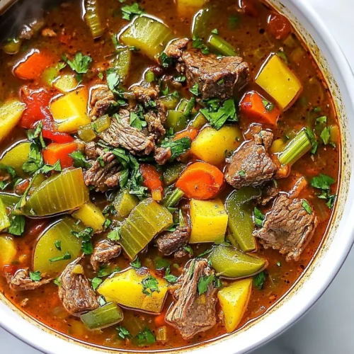 Homemade Hearty Vegetable Beef Soup is a warming dish that brings together the rich flavors of tender beef and a medley of fresh vegetables. This soup is perfect for cozy weeknight dinners or family gatherings, offering a comforting meal that appeals to all ages. The combination of savory beef and vibrant vegetables creates a satisfying and nourishing dish that fills you up while being packed with nutrients. Its standout qualities include the ability to be prepared in one pot, making cleanup easy, and the depth of flavor that develops as it simmers. This recipe for Homemade Hearty Vegetable Beef Soup will quickly become a staple in your kitchen, providing warmth and comfort with every spoonful.