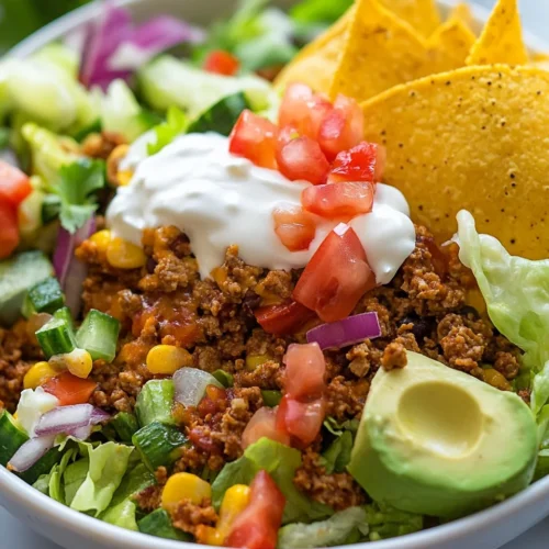One of the main reasons you will love this recipe is its incredible taste. The Simple Fresh Taco Salad features a medley of flavors that come from fresh vegetables, beans, and an array of toppings, offering a satisfying crunch with every bite. Another standout quality is the ease of preparation; this salad can be assembled in under 30 minutes, making it a great option for busy weeknights. The cooking method is straightforward and requires minimal effort, which is perfect for those who might not be experienced in the kitchen. Furthermore, the salad’s texture is a delightful combination of crisp, crunchy, and creamy elements that create a harmonious eating experience. Lastly, the Simple Fresh Taco Salad is incredibly versatile. You can easily customize it with your favorite ingredients, making it suitable for various dietary preferences and occasions, which adds to its appeal.