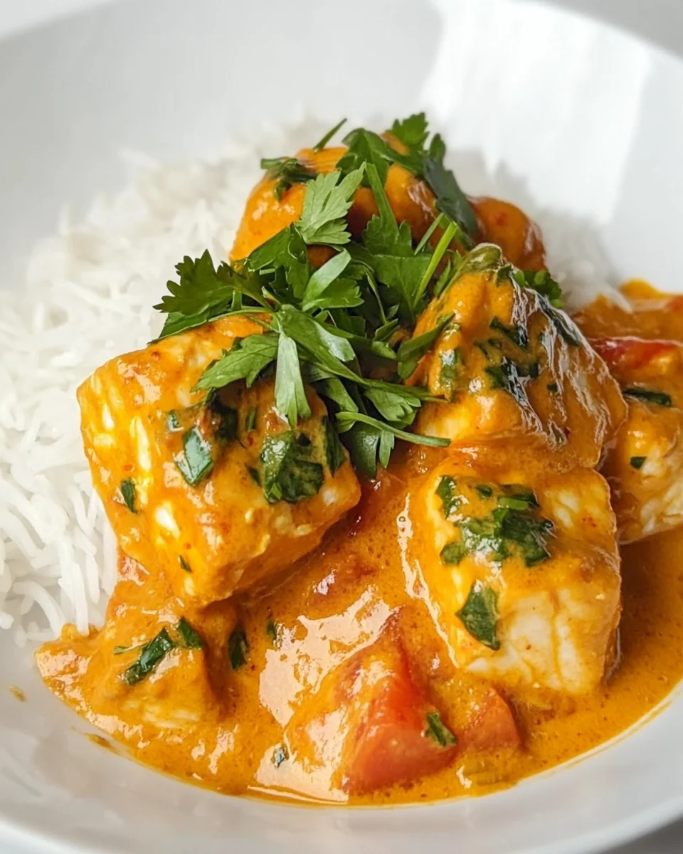 - Once the monkfish is cooked, remove the skillet from heat. Garnish the curry with fresh cilantro leaves, adding a pop of color and a refreshing finish.