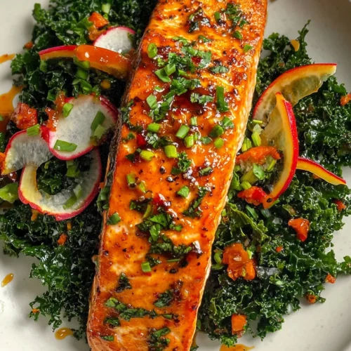 The Simple Sriracha Honey Salmon with Fresh Kale is a dish that embodies a perfect balance of sweet and spicy flavors, making it a culinary favorite for many. This recipe combines the rich, buttery taste of salmon with a zesty sriracha honey glaze, which caramelizes beautifully during cooking. The fresh kale not only adds a vibrant green color to the plate but also provides a nutritious boost, making this dish a wholesome option for weeknight meals. Ideal for families and busy individuals, this recipe can be prepared in under 30 minutes, making it suitable for anyone looking to enjoy a quick yet delicious meal. The standout qualities of this dish are its ease of preparation, bold flavors, and the nourishing benefits of fresh ingredients.
