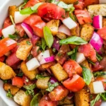A vibrant and refreshing Tuscan salad combining ripe tomatoes, cucumbers, red onions, and crusty bread with a zesty homemade dressing.