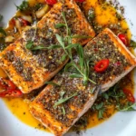 A culinary masterpiece featuring seared salmon fillets with a crispy crust and rich spiced butter.