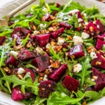 A vibrant salad combining earthy roasted beets with peppery arugula, dressed in a tangy balsamic vinaigrette.