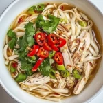 A comforting, flavorful dish featuring tender chicken, fresh vegetables, and perfectly cooked noodles in a savory broth.