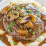 A classic dish featuring juicy, seasoned patties made from ground beef, enveloped in a rich, savory gravy.