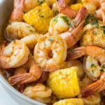 A vibrant and flavorful dish featuring juicy shrimp, tender potatoes, and sweet corn, all cooked together in a seasoned broth.