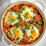 Create wells in the mixture and crack an egg into each well. Cover and poach for 5-7 minutes.