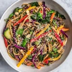 A vibrant and nutritious salad combining colorful vegetables with hearty rice noodles, perfect for any occasion.