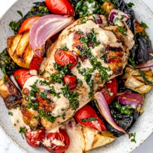Zaatar Chicken with Roasted Vegetables and Tahini Delight is a vibrant and flavorful dish that brings together the aromatic spices of zaatar and the wholesome goodness of roasted vegetables, all drizzled with a creamy tahini sauce. This meal is perfect for busy weeknights or family gatherings, as it showcases a harmonious blend of flavors that appeals to a wide audience. The juicy chicken, infused with the herbal notes of zaatar, complements the caramelized sweetness of the roasted vegetables, making every bite a delightful experience. The addition of the tahini sauce not only enhances the dish but also provides a rich, nutty flavor that ties everything together. Each element of this recipe shines, offering both comfort and a touch of culinary adventure.
